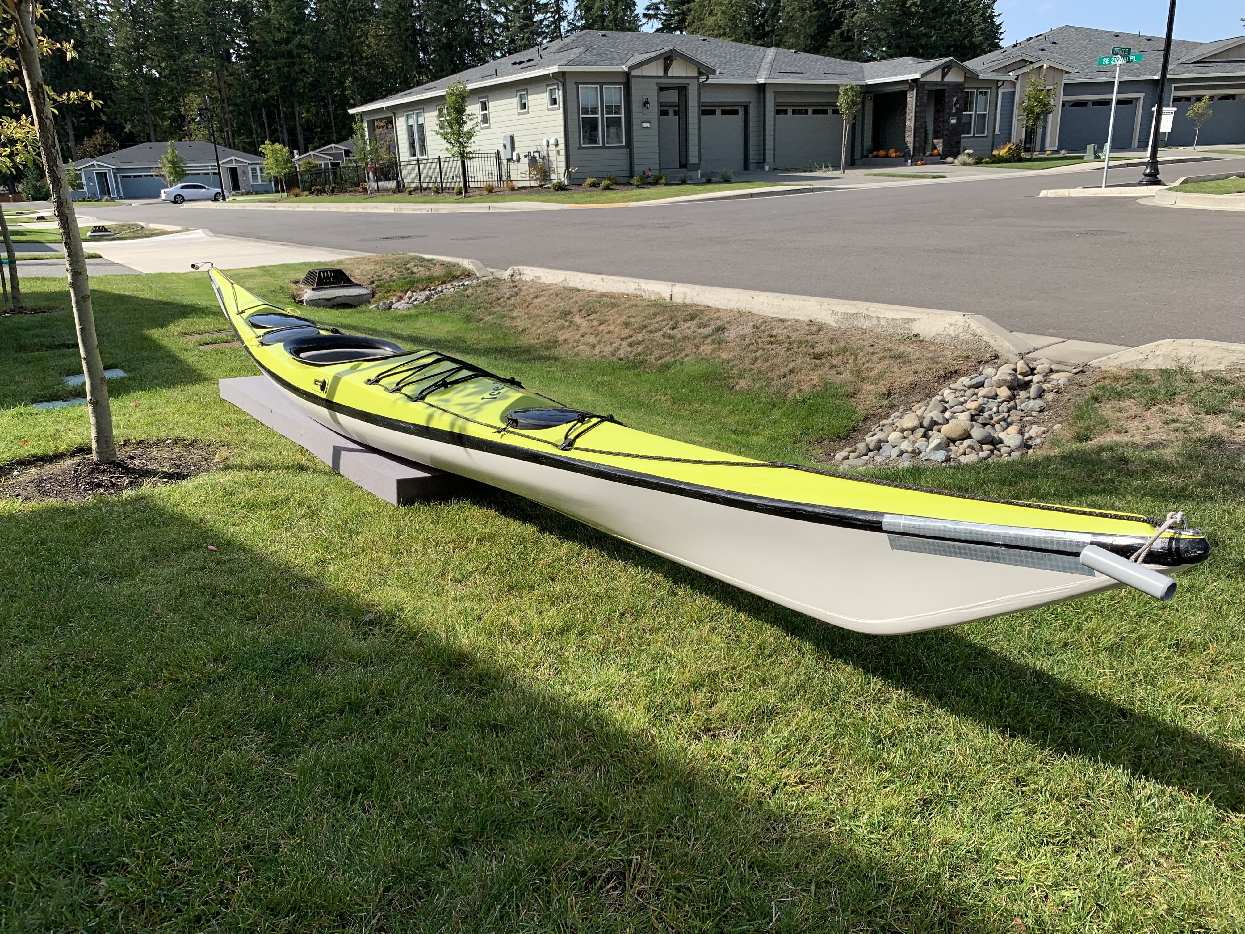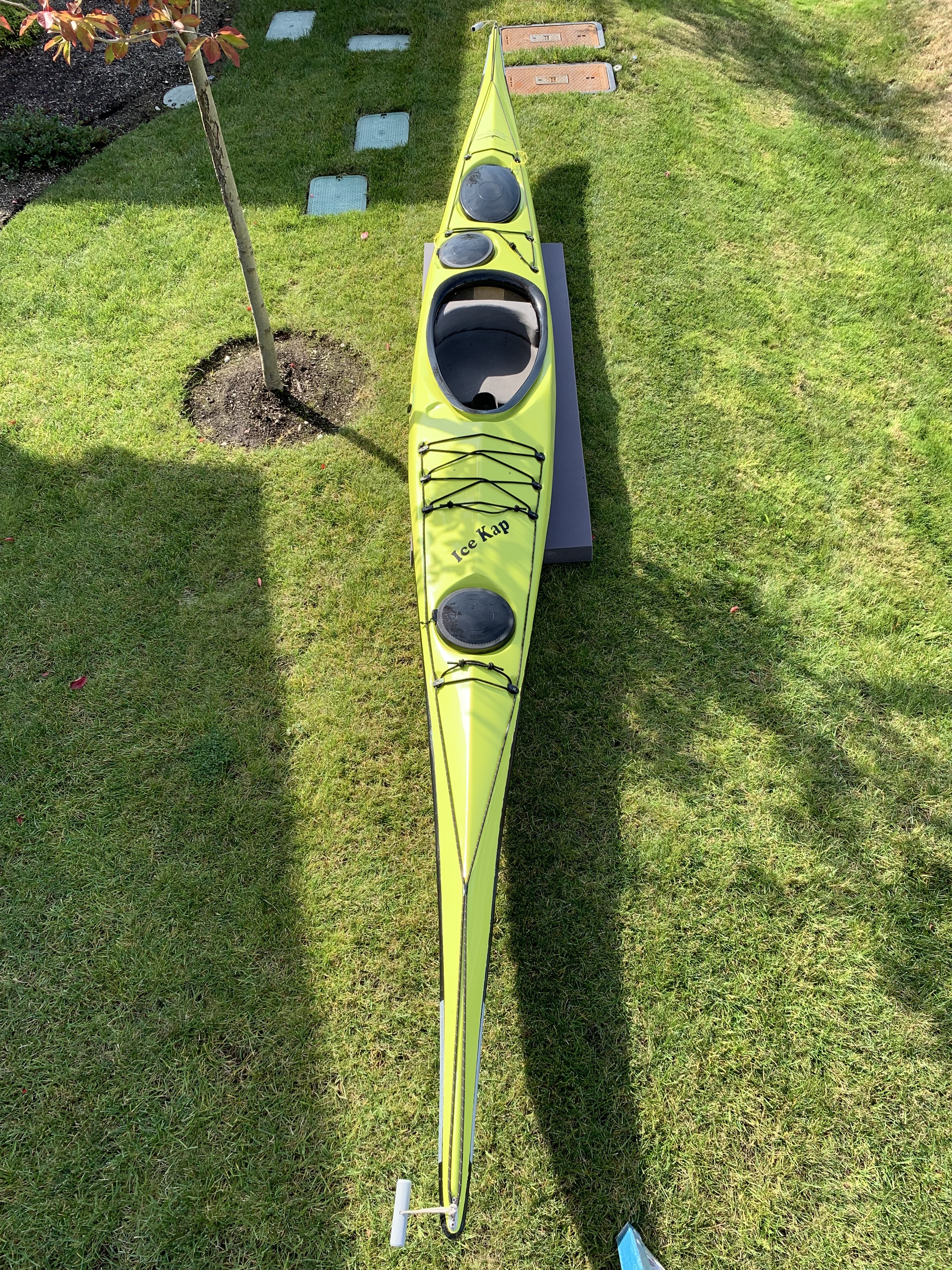 SOLD Sterling Ice Kap Kayak, well-maintained and in good condition. This older model, from 2009, features a drop-down skeg positioned near the stern. Weight is 48.5 lbs. Coaming inside measures 34 x 15.5 inches. The beam is 19.5 inches, and its length is 16 feet 10 inches. High-performance, maneuverable, easy to roll, tracks well, and good in the surf. I live in Black Diamond, WA.