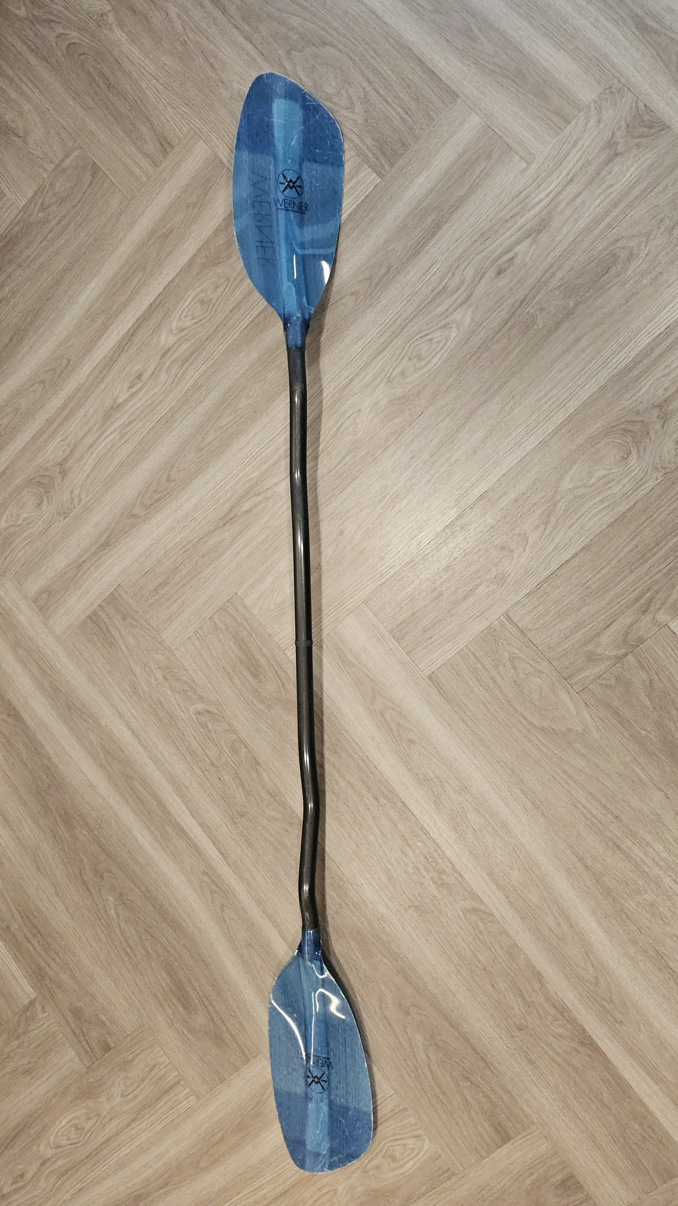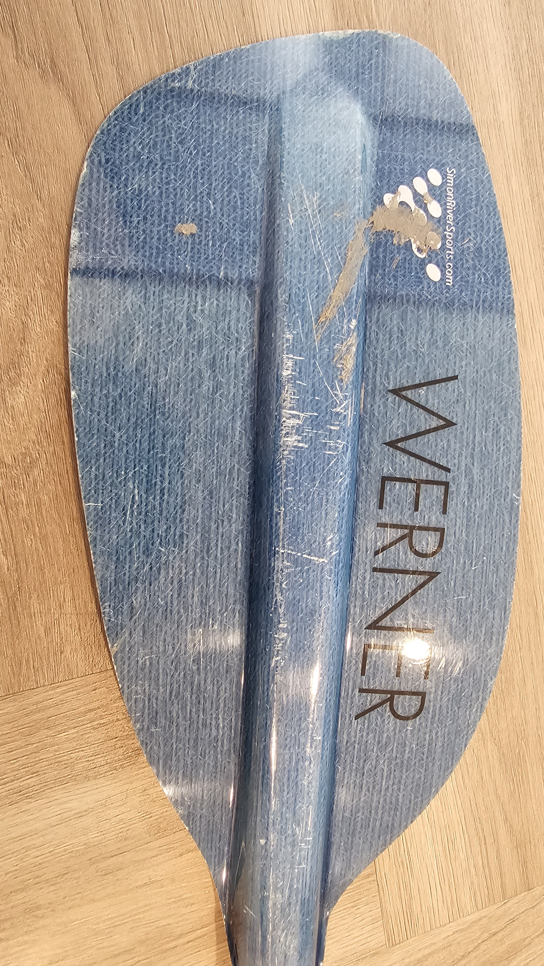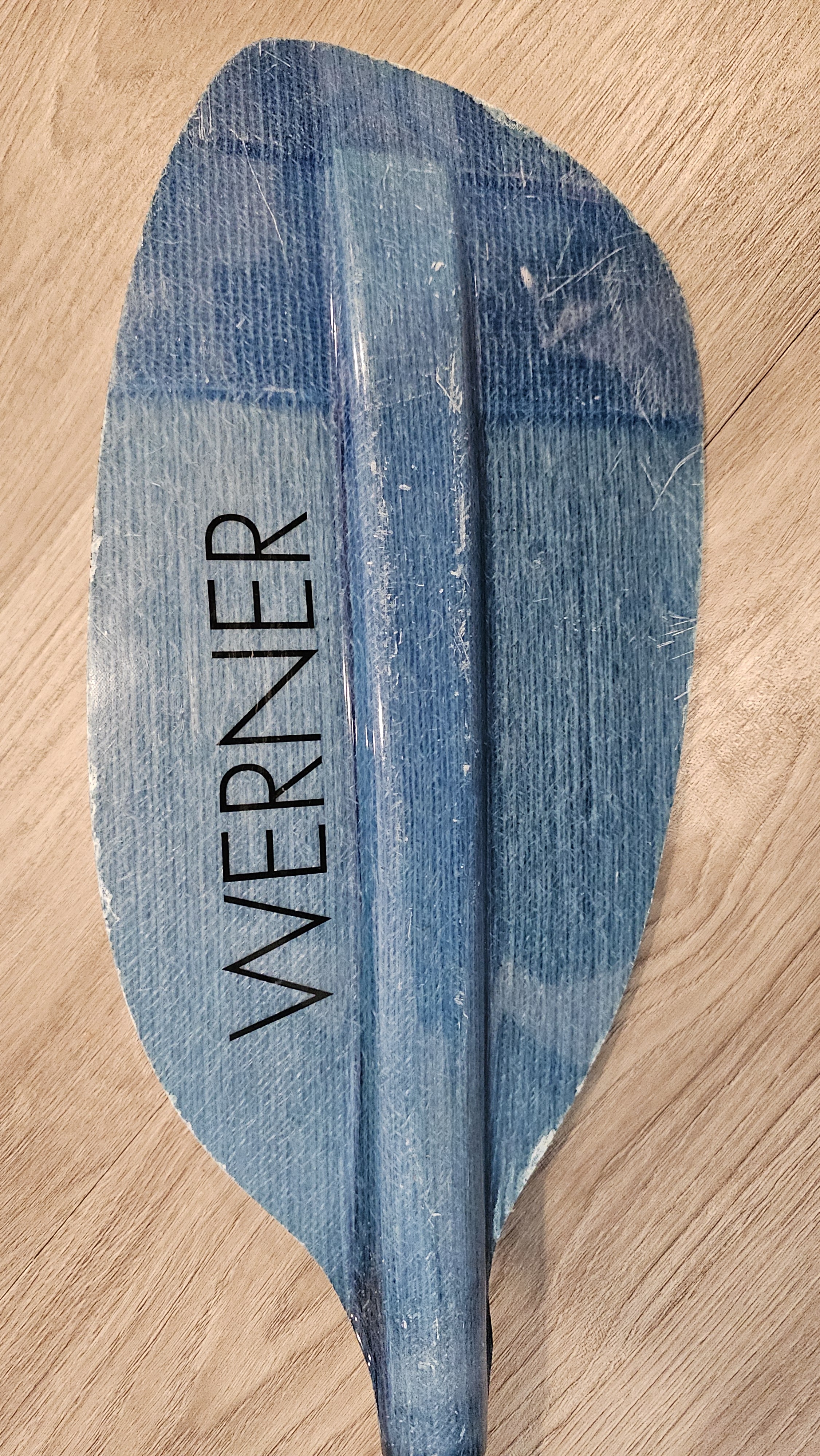 SOLD - Werner whitewater paddle - fiberglass, 1 piece, 194cm, bent shaft, R30. It has a bit of what looks like gray bondo in the middle of one of the blades that prior owner said he accidently got on it when he was working on something else. I couldn't see any damage from either side of paddle. - 250 dollars.