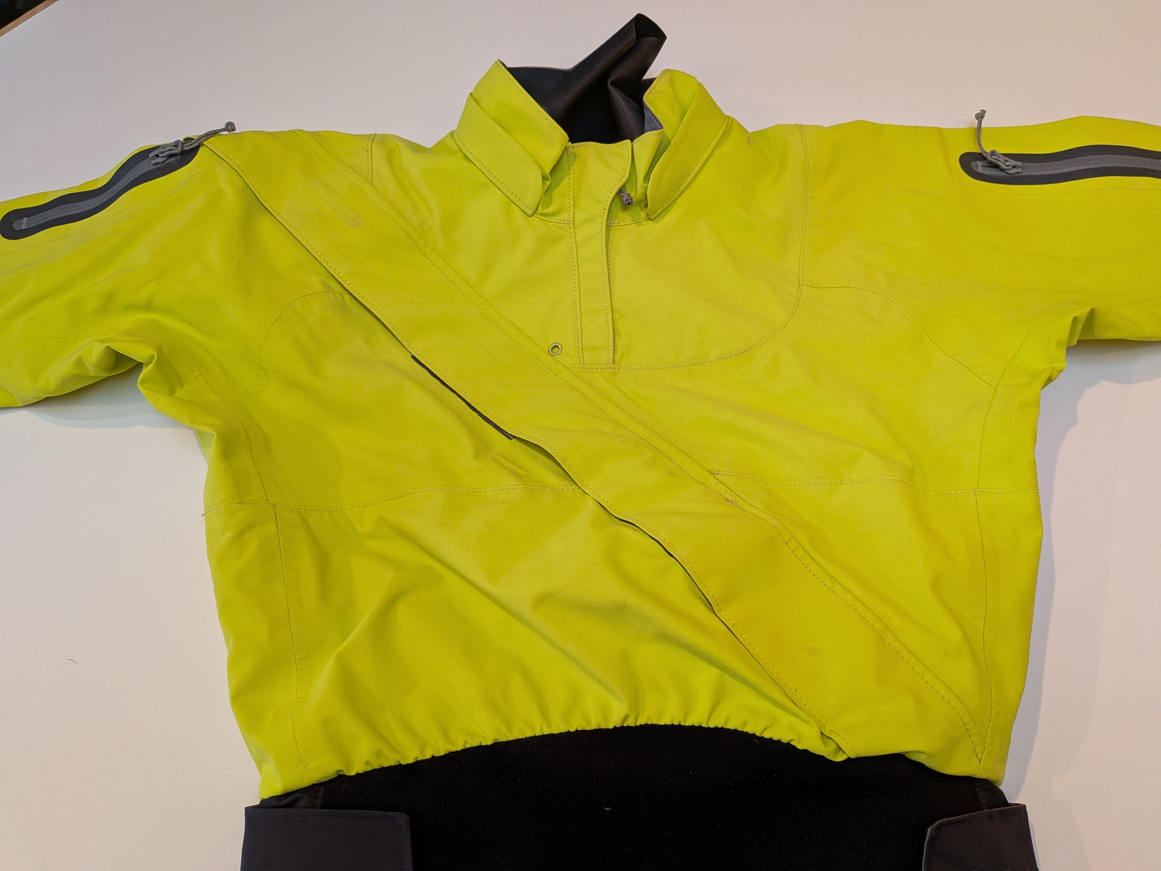 This suit is an earlier generation of Kokatat’s Odyssey Gore-Tex Pro. It is in like-new condition (worn approximately 10 times) and was custom made. It is a women’s suit size small and has a front relief zipper.